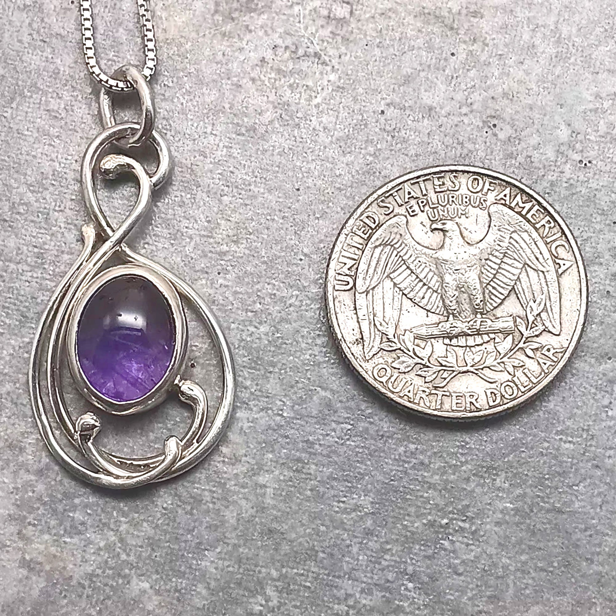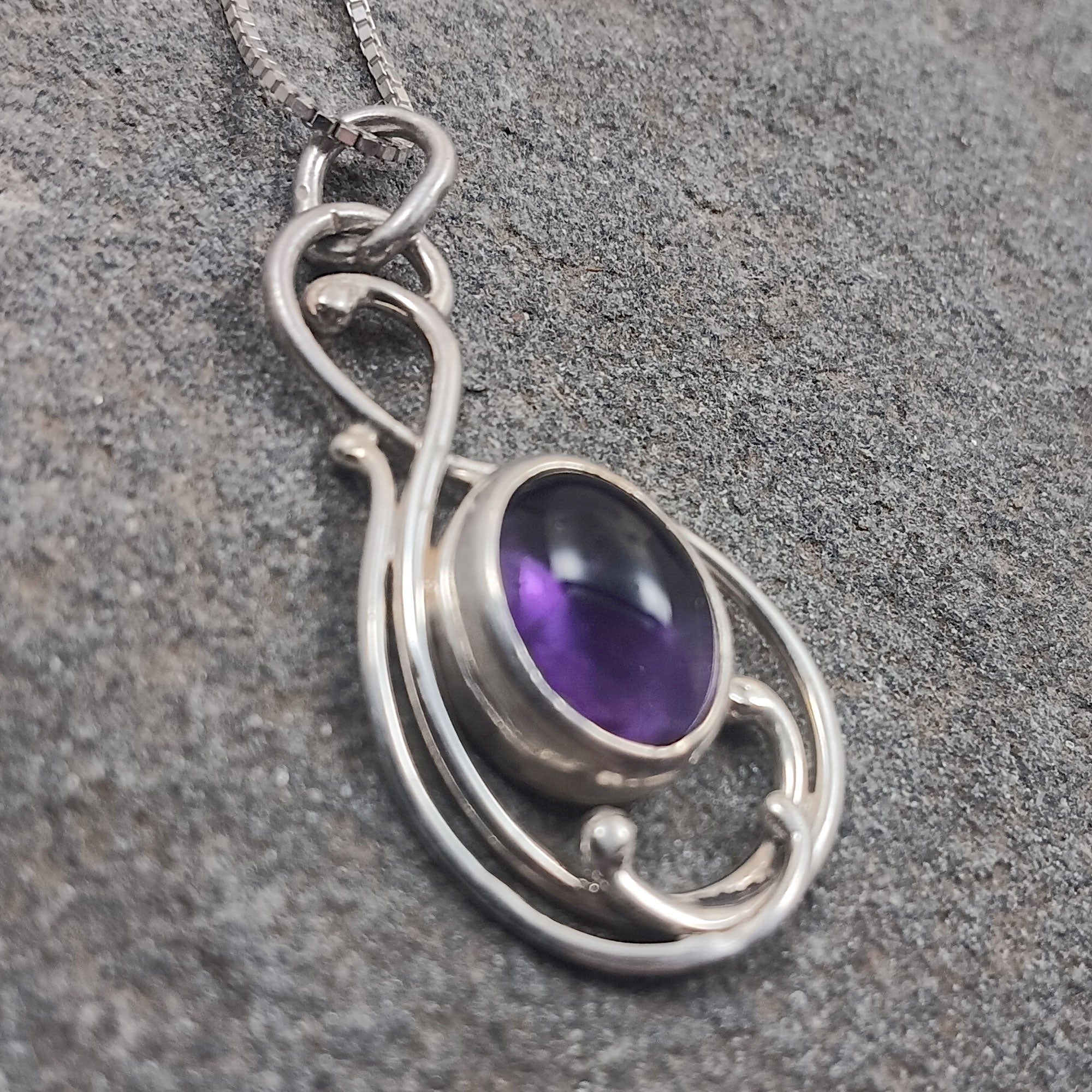 This stone is a purple 11 by 9 mm oval deep purple cabochon set in a simple art nouveau sterling silver pendant design.