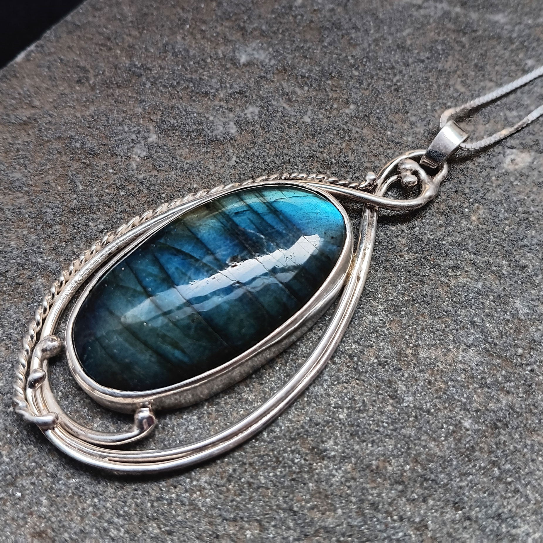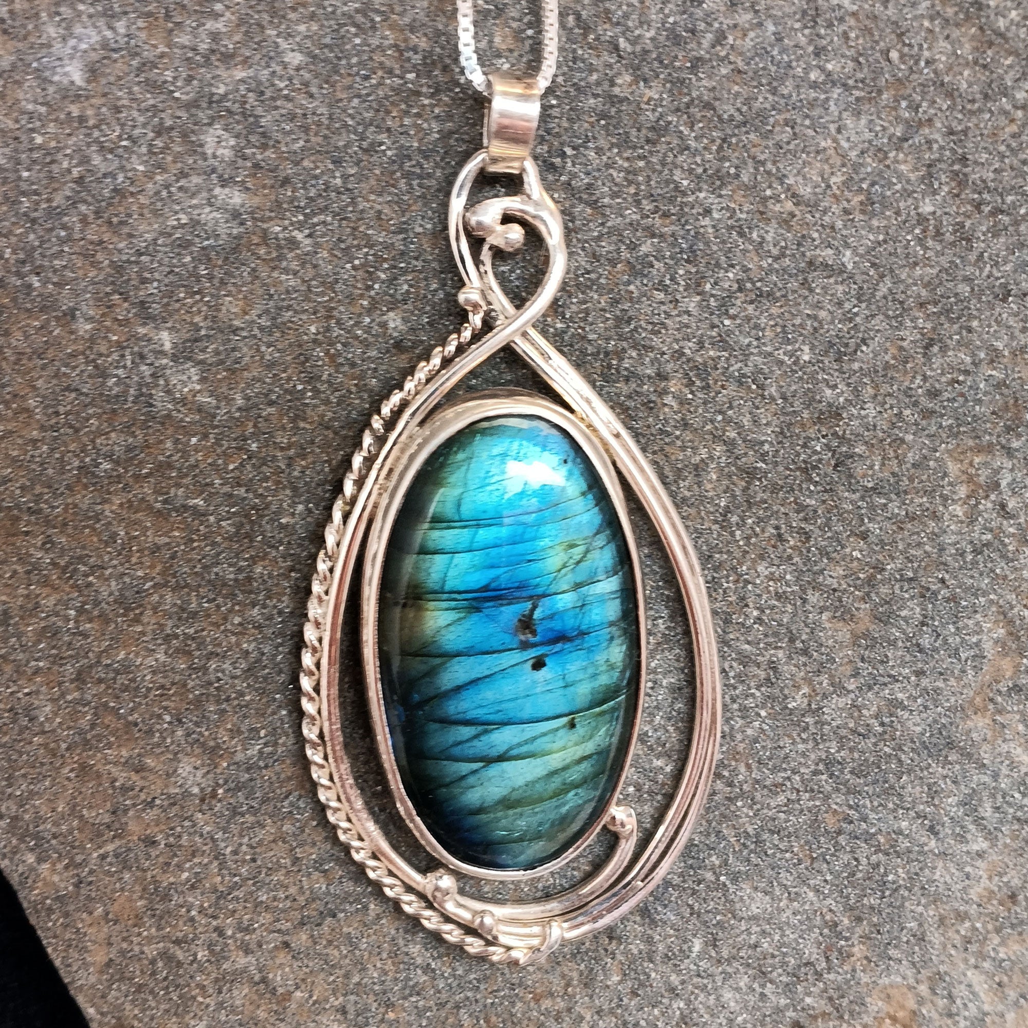 Here's a green and blue Labradorite gemstone in an Art nouveau one of a kind Sterling Silver setting.