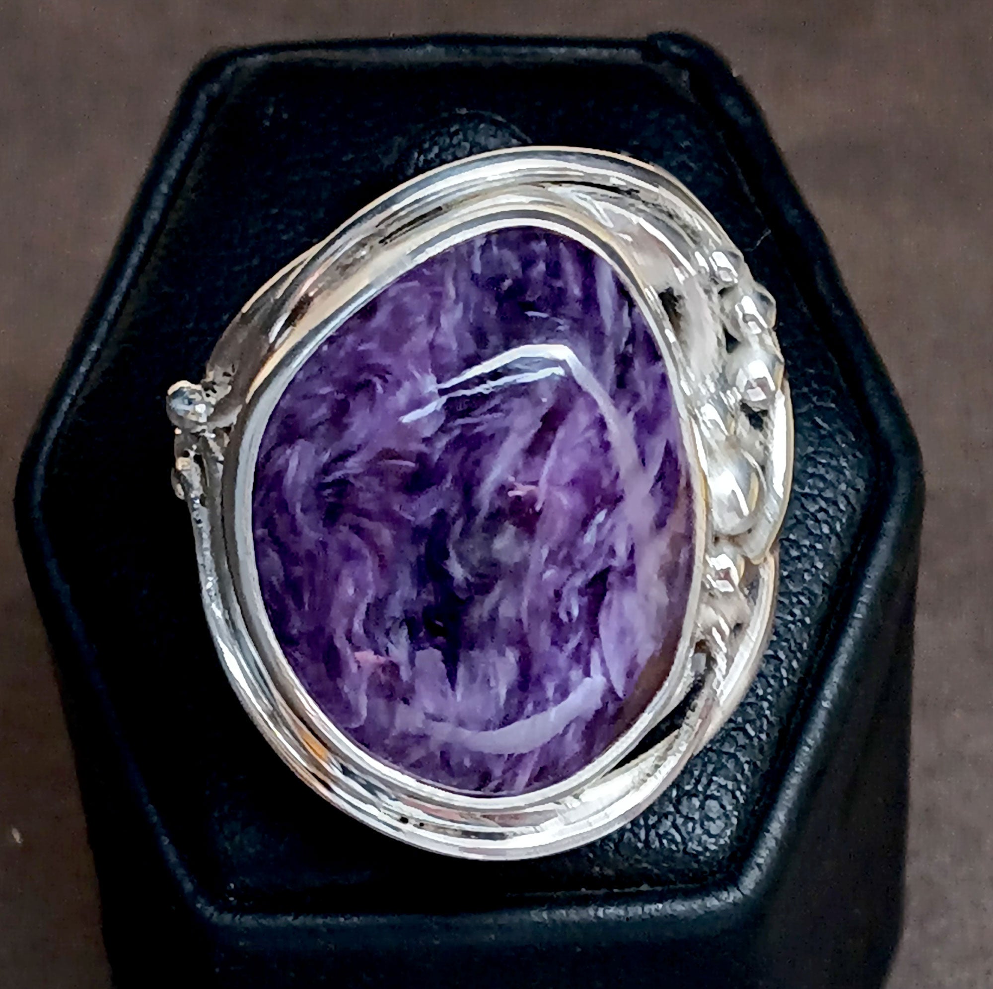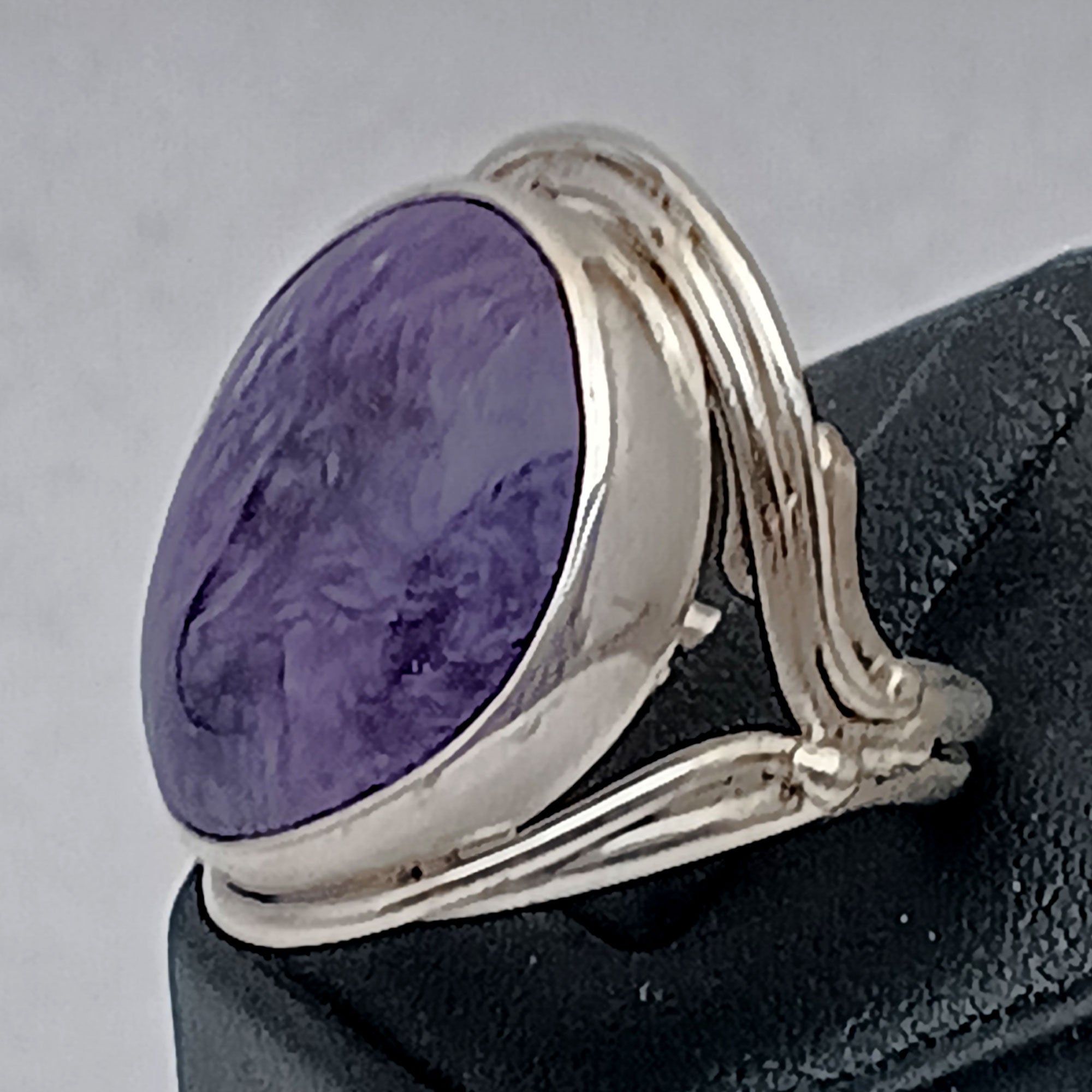 This is a stunning and Regal Vivid and Bright Purple Charoite Gemstone set in a one of a kind Art Nouveau ring design. This ring is a size 7 3/4 but can be sized from a 6 to a 10.