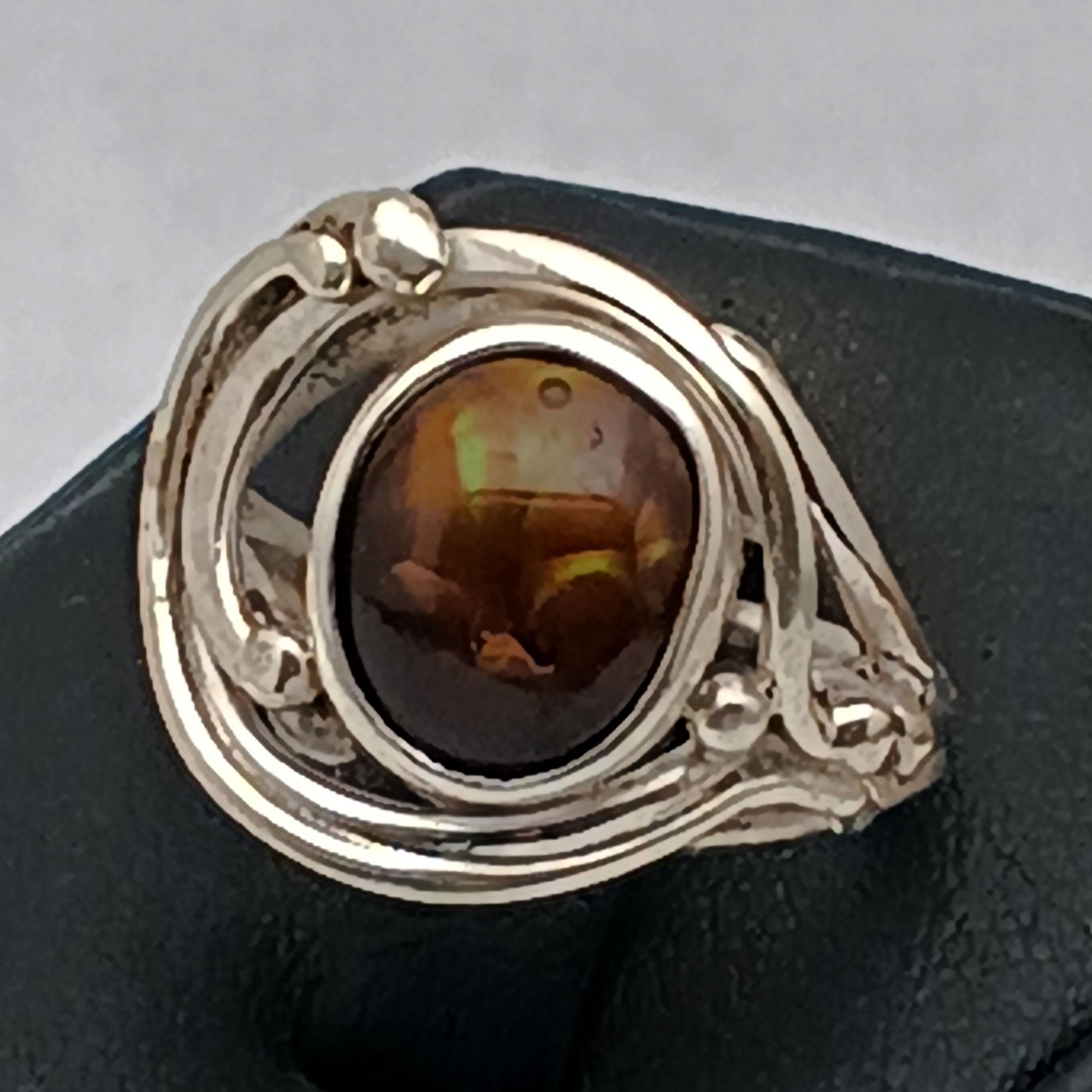 Here is a small sized hand cut range red and orange Fire Agate set in a lighter gage one of a kind Art Nouveau wave ring setting. There is a bit of green also in the stone.