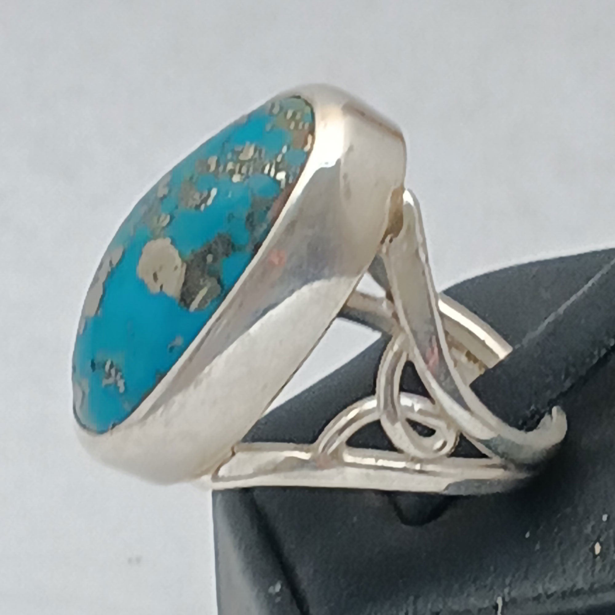 This beautiful Natural turquoise is a beautiful blue high grade polished stone with iron pyrite crystals on the surface. It is set in an heavy split shank ring design.l.