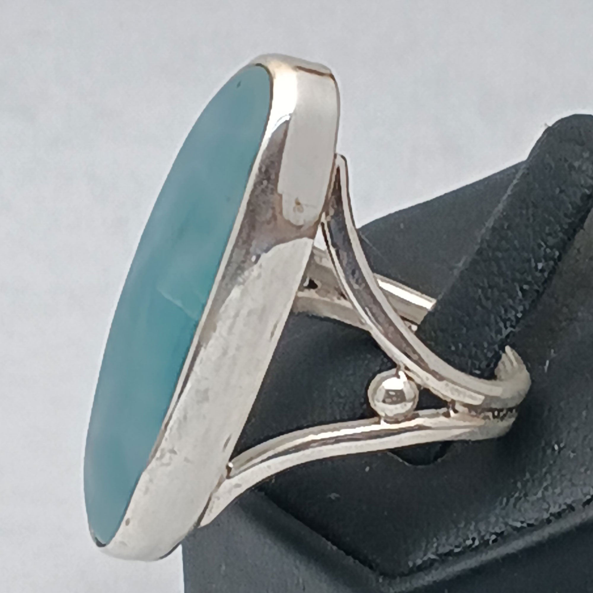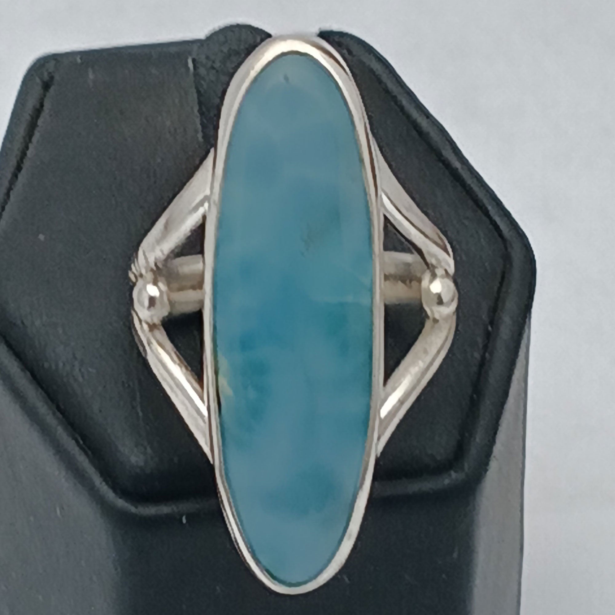 Here is an elegant long oval Blue Larimar Gem Stone set it in a medium gage art nouveau split shank design.
