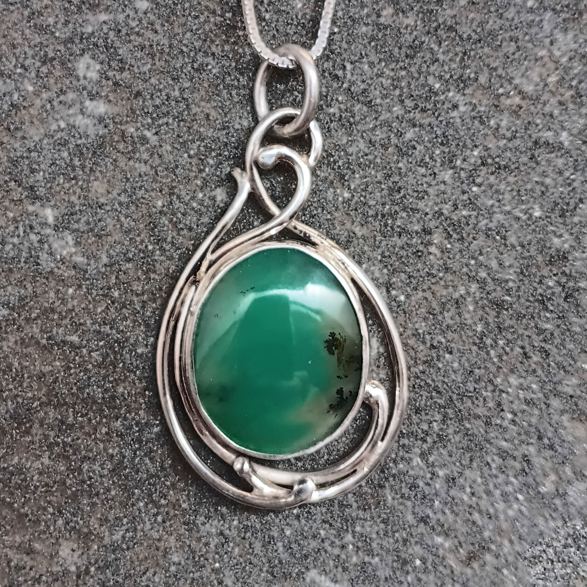 Here is a beautiful high grade hand cut free form Australian chrysoprase in an elegant Art Nouveau pendant design.